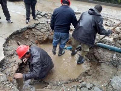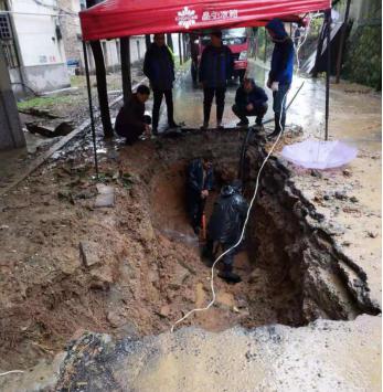 因爆管事件突發(fā),搶修人員趕到現(xiàn)場時,水泥路面已塌陷出一個大坑,馬路上到處是積水,天空還下著雨。為了盡快修好爆裂管道,在最短時間恢復(fù)供水,搶修人員不懼艱辛,不顧泥水和雨水的困擾,齊心協(xié)力、緊張有序地進行著漏點的搶修。經(jīng)過近4個小時的奮力搶修,終于完成了瑪麗醫(yī)院DN400PE管修復(fù)工作,保障了群眾正常用水。