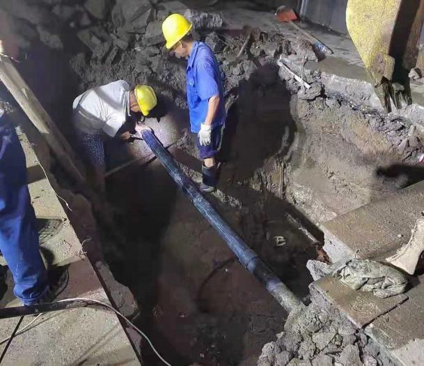 DN600管徑是襄城輸配水主管線,炎熱夏季正值用水高峰,閘門一旦關(guān)停就會造成大面積用戶停水。由于該地段有3個不同高度的地平面,而漏點又在停車場內(nèi),地形錯綜復(fù)雜不利于大型設(shè)備開挖??阂嘬姷葲]有等待,與商都負責(zé)人郭洪取得聯(lián)系一起協(xié)調(diào)車輛疏散,核實最佳地點開挖面積長15*2米,于晚22:15用水峰值下來后立即停水維修D(zhuǎn)N600開口夾板,于15日0:15分完成搶修開水,2:00完成回填維修完畢。