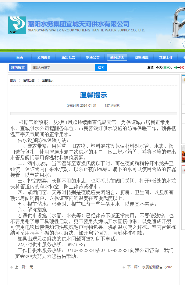 近日,我市出現(xiàn)強(qiáng)降雪天氣,極端低溫天氣易造成供水管網(wǎng)、水表、水龍頭等設(shè)施的凍損,影響市民用水安全。為保障全市供水安全穩(wěn)定,宜城天河供水公司堅持提前部署、預(yù)防為主、及時搶修原則,扎實(shí)做好寒潮及春節(jié)期間保障供水的防御和應(yīng)對措施準(zhǔn)備。